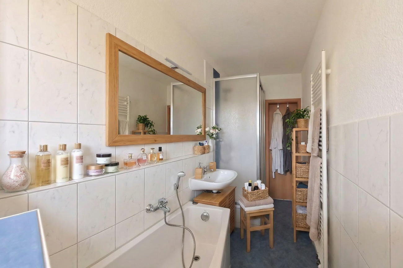Badezimmer mit Wanne und Dusche: Sie haben die Wahl zwischen einem erfrischenden Duschgang oder einem entspannenden Bad je nach Vorliebe, Stimmung oder Zeit.